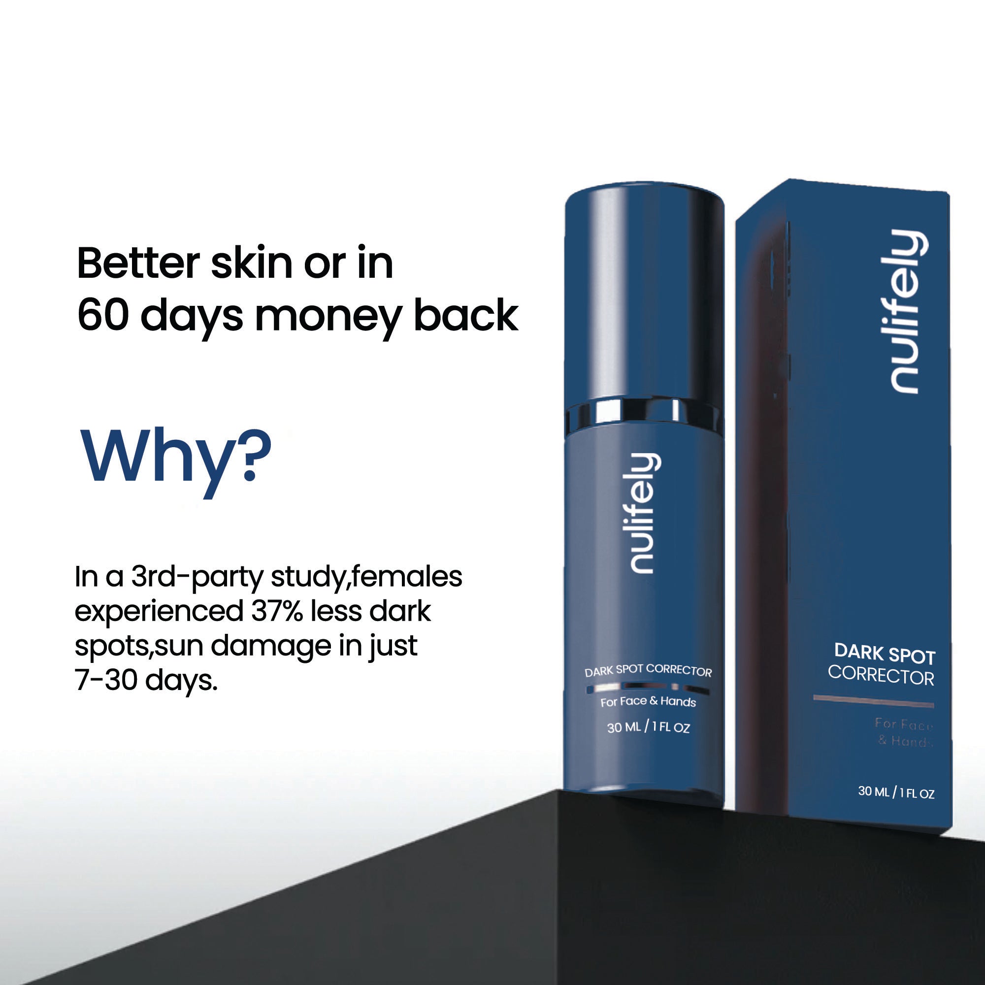 Nulifely Dark Spot Corrector fades discoloration, evens skin tone, and restores radiant clarity in just weeks—visible results you can trust.